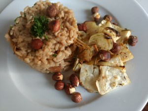 zelfgemaakte paddenstoelenrisotto met geroosterde knolselderij en geroosterde hazelnoten